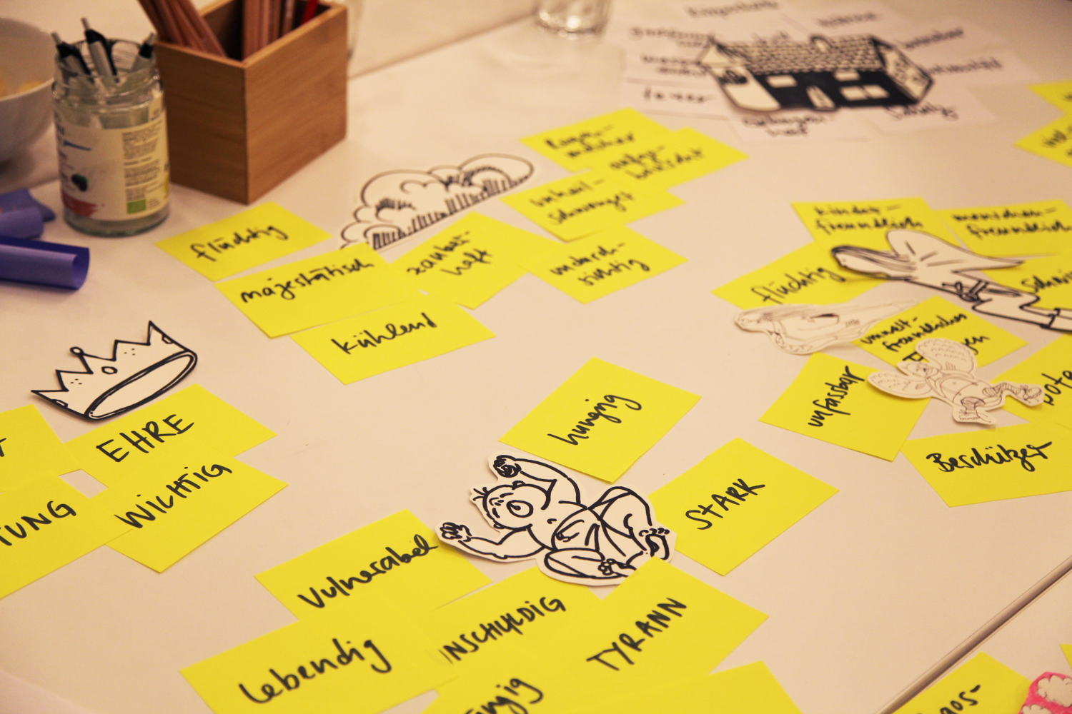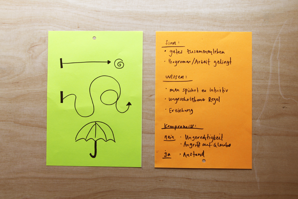 Die Notizen aus dem vorangegangenen Gespräch inspirieren uns zu einem grossformatigen Gemeinschaftsbild, das wiederum neue Geschichten in sich birgt.
