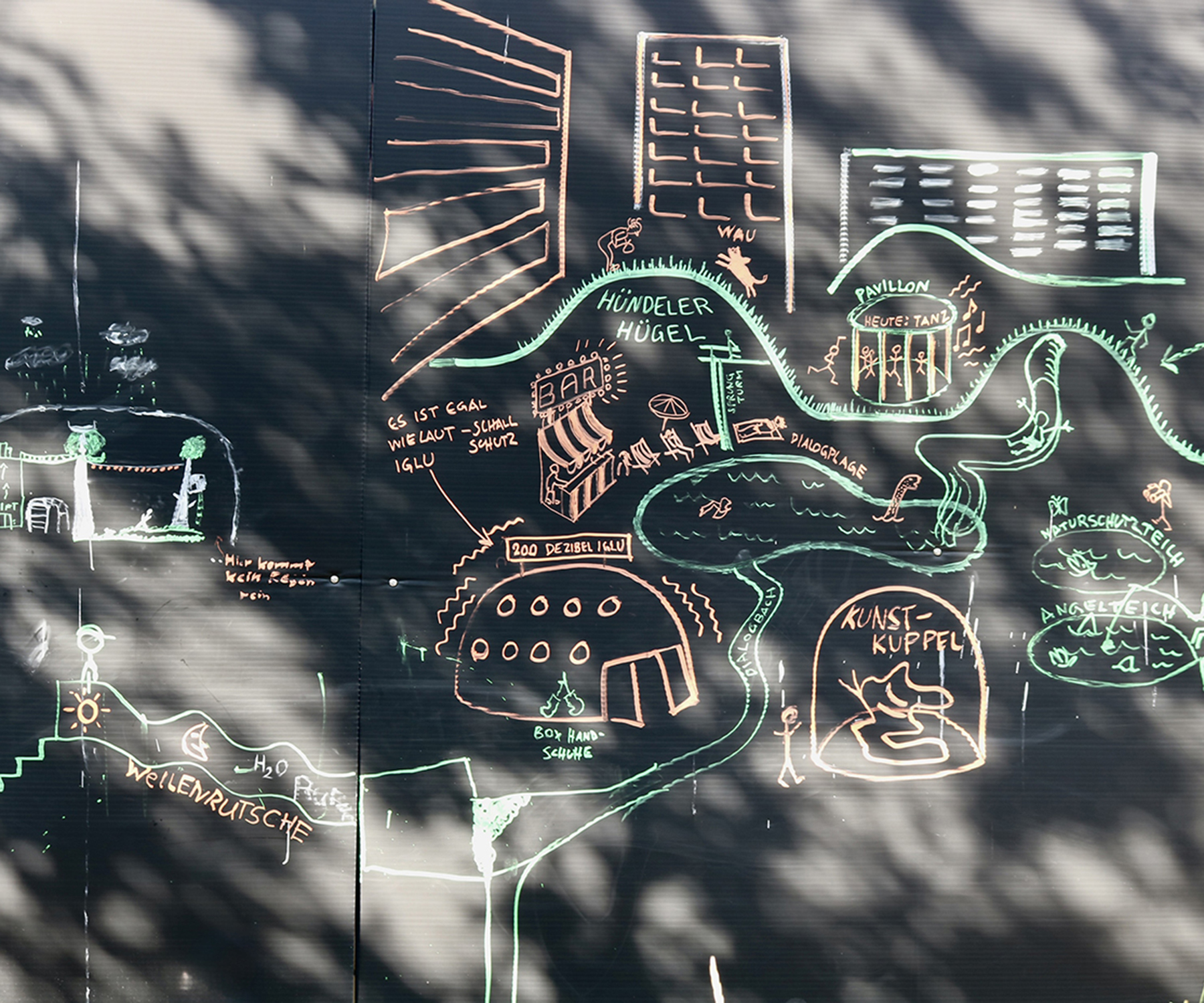 Wir haben eingeladen zum forschenden Flanieren auf dem Dialogplatz: Wer ist da? Wer tut was auf dem Platz? Welche Spuren aus der Vergangenheit sind zu entdecken? Und: Was sind deine Träume für die Zukunft des Platzes? Was könnte er für die Nachbarschaft bedeuten? – Eine Runde drehen mit der Cat-Camera am Schuh, ein Go-Along-Interview führen, eine Klang-Tour mit Stecken und Tennisball machen oder den Raum mit Absperrband erforschen: Gemeinsam haben wir verschiedene Erkundungs-Sets für Gross und Klein entwickelt, mit denen der Dialogplatz währenddrei Wochen erforscht werden konnte. Die gesammelten Fakten, Geschichten und Träume sind im Orbit-Schaufenster zusammengekommen.