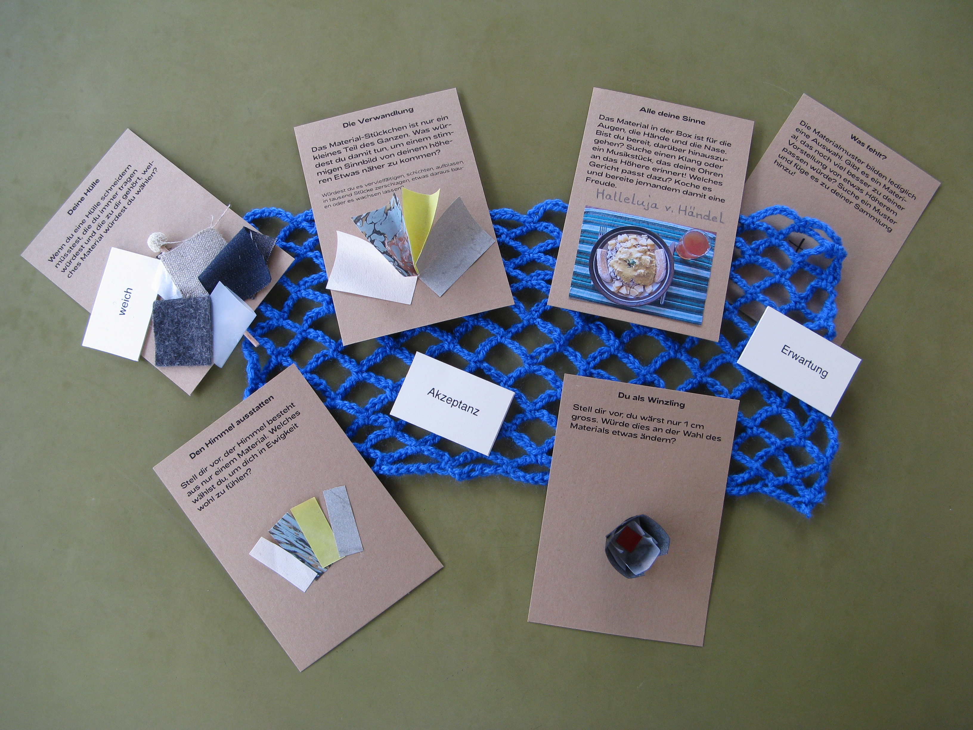 Wir haben Materialstücke, Fragekarten und Begriffe zu einem Paket zusammengestellt und an 15 Personen verschickt, zusammen mit der Einladung, sich Zeit zu nehmen, um den ganz persönlichen Vorstellungen von «etwas Höherem» Ausdruck zu verleihen.