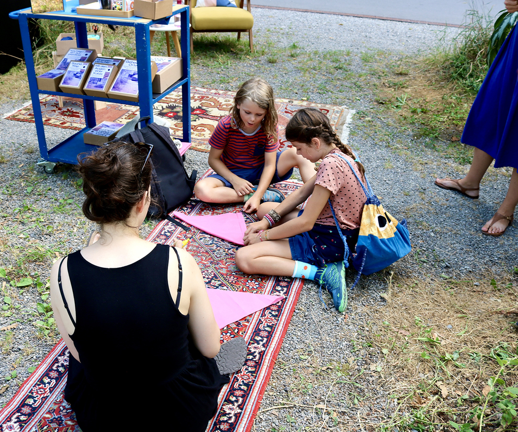 Das Orbit-Kreativstudio füllte sich nach und nach mit kleinen und grossen Menschen. Ein lebendiger Nachmittag zwischen bunten Stoffen und leuchtenden Stoffmalfarben! «Warum macht ihr das nicht immer?!» – die Reaktionen der Besucher:innen zeigten, dass unser Angebot auf Anklang stiess. Die einfachen Drucktechniken und die Mithilfe beim gemeinschaftlichen Nähen der grossen Dialogplatz-Wimpel-Kette boten für jede und jeden einen Einstieg. Die Wimpel wurden am Abend beim Konzert von Lhanzom Lhasam dann sogleich gebührend eingeweiht. Auf dass die farbigen Dreiecke noch bei vielen Festen im Wind wehen mögen! ︎
