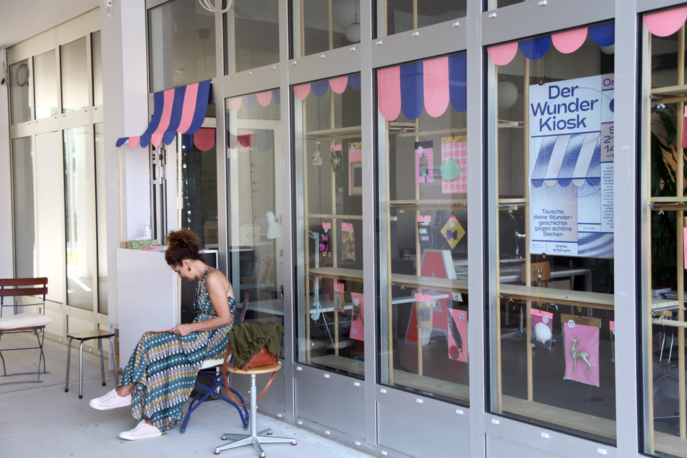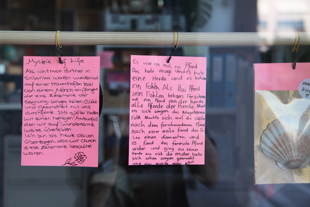 In unserem Wunder-Kiosk waren schöne kleine Sächeli zu haben – aber nicht für Geld, sondern im Tausch gegen persönliche Wundergeschichten! Wir fragten die Besucher*innen nach einem erstaunlichen, übernatürlichen, unglaublichen Erlebnis. Der Bogen reichte vom Fund einer 50er-Note über aus dem Nichts auftauchende magisch-unheimliche Objekte bis hin zu einer wunderbaren Bewahrung! Doch auch das Leben selbst wurde als Wunder begriffen und dankbar gepriesen. Die Geschichten wurden von denjenigen, die sie erlebt hatten, aufgeschrieben und in den Kiosk gehängt.