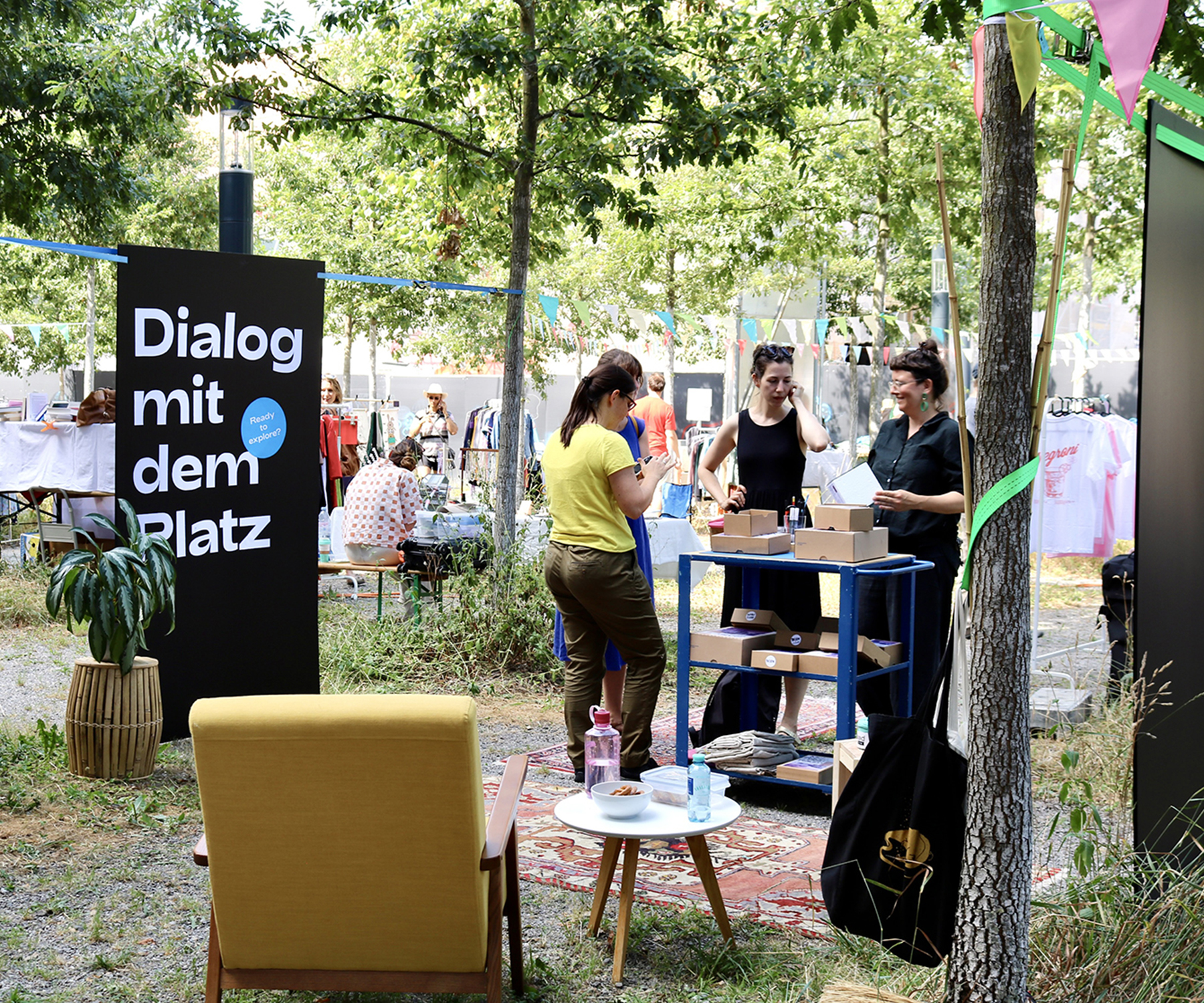Dialogplatzfest mit Kleidertausch, Drucken, Wimpelnähen, Tavolata und Konzert